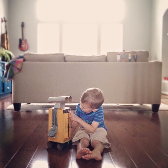 All. The. Time. Repurposing trash and/or our belongings as spy gear, pirate gear, creature gear, robot gear, etc. I also often find him sitting quietly, absorbed in books. He loves to be outside "checking on the garden" (digging in the garden while wearing a cowboy hat) or running around in the grass pretending to be a cheetah or a bison. New summer favorites are the splash pad and the swimming pool.